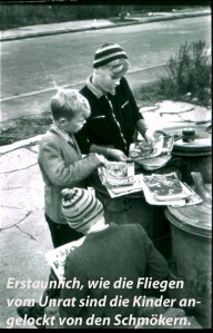 Abb. „Jungen an den Mülltonnen“ – Aus einer Diareihe der Landesmedienstelle Niedersachsen (ca. 1955) mit Zitat aus dem Begleittext