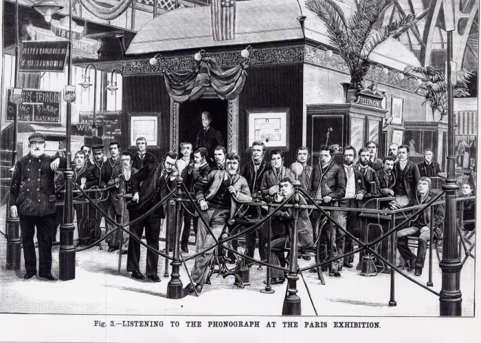 Abb. Listening to the phonograph at the Paris Exhibition: Scientific American 1889, S. 231