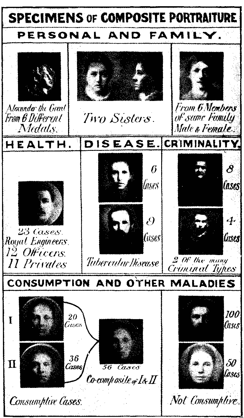 Mit Hilfe der Fotografie wollte Galton gemeinsame Merkmale von Ethnien und Berufsgruppen, aber auch den Typus des Verbrechers herausarbeiten. Er benutzte dafür sogenannte Komposit-Porträts. Dabei wurden gleich große Porträts von Angehörigen einer Gruppe – Offiziere, Verbrecher, Verwandte – nacheinander auf dieselbe Platte aufgenommen, so dass ein „Idealportrait“ entsteht, das die Gesichtszüge aller Beteiligten vereint. Durch die Übereinanderschichtung dieser Porträts sollten sich die individuellen Besonderheiten verwischen und gemeinsame Merkmale eines „Typus“ hervortreten.