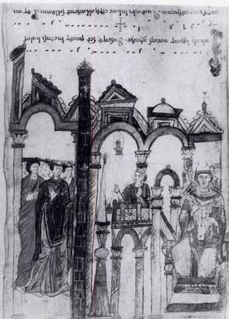Bei dem oben stehenden Bild handelt es sich um den Ausschnitt aus einer solchen Rolle aus dem 12. Jahrhundert. Bei näherem Hinsehen stellt man fest, dass der Text am oberen Bildrand auf dem Kopf steht. Die oft über 6m langen Pergamentrollen enthielten eine Folge von großformatigen Bildern mit den dazugehörigen Texten. Der Prediger rollte sie von der Kanzel aus ab. Die Zuhörer betrachteten die Bilder, während er selben den Text vorlas.  Deshalb steht von den Bildbetrachtern aus gesehen, der Text auf dem Kopf.