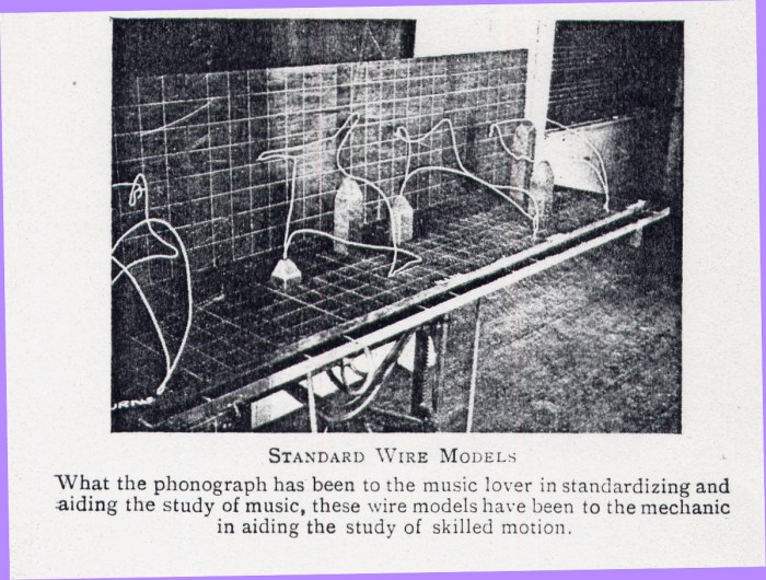 Da Gilbreth davon ausging, dass es kaum möglich war, aufgrund einer Filmvorführung eine klare Vorstellung von den tatsächlichen Bewegungsabläufen zu entwickeln, setze er die Ergebnisse seiner Studien in dreidimensionale Drahtmodelle um. Durch diese Drahtmodelle würde es Arbeitern möglich – so Gilbreths Annahme – zu begreifen, wie sich ihre Bewegungsabläufe perfektionieren ließen.