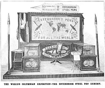 A Steel Pen Exhibit At The Fair (1893)Wenn man sich die Ausstellung der Esterbrook Steel Pen Company auf der World`s Columbian Exposition ansieht, begreift man sofort, dass selbst ein so kleiner Gegenstand wie eine einfache Stahlfeder zur Grundlage einer Industrie, der beachtliche Bedeutung zukommt, werden kann. Die Firma wurde 1860 gegründet. In den Fabrikanlagen in Camden, N. J., werden über 150 verschiedene Sorten von Esterbrooks Federn hergestellt, die ihren Markt in allen Teilen der Welt finden. […] Es handelt sich um eine Produktion, die nicht im kleinen Maßstab betrieben werden kann, da der Herstellungsprozeß aufwendig und kompliziert ist. Jede Feder wird vier bis fünf Mal hoher Hitze ausgesetzt und läuft durch vierzig bis fünfzig Hände bevor sie fertig gestellt ist. Die Qualität der Esterbrook Federn ist anerkannten Qualität. Dafür spricht ihre weltweite Popularität. Es ist eines Wunder der modernen Herstellungsprozesse, dass dabei die Kosten für diese heutzutage unverzichtbaren Gegenstände auf ein Minimum gesenkt wurden. Scientific American 16.11.1893, S. 181 „Die World’s Columbian Exposition 1983 (auch The Chicago World’s Fair) war eine vom 1. Mai bis zum 30. Oktober 1893 in Chicago veranstaltete Weltausstellung, die neunzehnte ihrer Art. Die Ausstellung fand zum vierhundersten Jahrestag der Entdeckung Amerikas durch Kolumbus statt.“ Zur Massenproduktion „Seit 1830 wurden in der englischen Stahlfederfabrikation Schraubpressen benutzt, die denen ähnelten, die in der Knopfmacherei schon längere Zeit verwendet wurden. Mit diesen Stanzmaschinen konnten aus den möglichst dünn ausgewalzten Stahlbändern massenweise Stahlfedern (von einer Schnellpresse bis zu 28000 pro Tag ausgeschnitten werden.“ (1) |