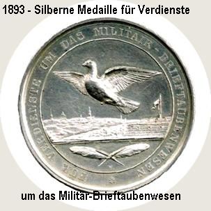 „Als Paris von den deutschen Truppen eng cerniert war, suchte man eine Verbindung mit der Provinz herzustellen. Von Paris aus ging dies sehr gut vermittels des Luftballons, aber man konnte nicht nach Paris hineinkommen, […]. Nachdem man eine Depeschenbeförderung auf die verschiedenste Weise versucht hatte, ohne zum Ziele zu kommen erinnert man sich der Brieftauben. […] Mit Hilfe der Photomikrographie wurden die Depeschen derartig verkleinert, dass man einer einzigen Brieftaube 40 000 Depeschen mitgeben konnte, welche in eine Federspule gesteckt wurden, die man an der mittelsten Schwanzfeder mit einem Seidenfaden bestetigte. […] Diese Erkenntnis brachte einen enormen Aufschwung des Brieftaubenwesens hervor. W. Hess: Die Taube als Briefbote, in: Prometheus. Illustrirte Wochenschrift über die Fortschritte in Gewerbe, Industrie und Wissenschaft, Nr. 89/1891, S. 579 f.Abb.: Die Medaille wurde an Züchter und verantwortliche Mitarbeiter im Militärdienst vergeben, die sich um das Brieftaubenwesen im Dienst des Militärs verdient gemacht hatten. – nach: http://www.ehrenzeichen-orden.de
