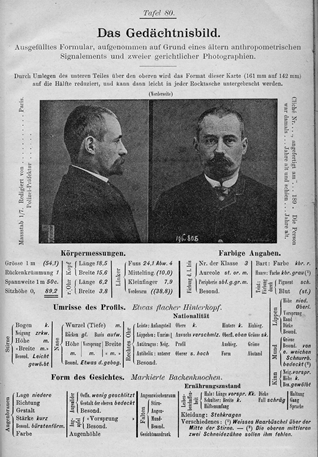 „[…] dass das beste und sogar einzige Mittel für den Detektiv, ein photographisches Bild gut dem Gedächtnis einzuprägen, darin besteht, sich eine genaue und vollständige Beschreibung desselben schriftlich anzufertigen […]. Der Fahndungsbeamte, der mit der schwierigen Aufgabe betraut ist, an der Hand einer Photographie einen Verbrecher auszuforschen und anzuhalten, muss im stande sein, die Züge und die Gestalt des Verfolgten aus dem Kopfe zu beschreiben, daraus mit einem Wort eine Art ‚Gedächtnisbild’ zu machen.“ (ebd. S. XIII)