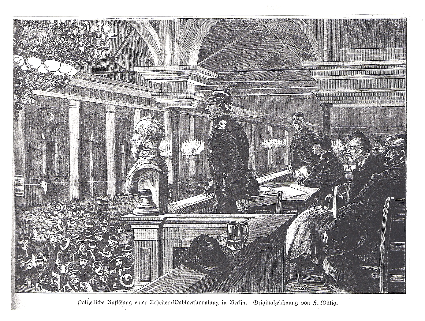 „Ein unvermeidliches Uebel aller Parteiversammlungen ist der Ruhestörer. Erscheint er nur vereinzelt auf der Bildfläche, so ist er bald unschädlich gemacht, schwieriger gestaltet sich der Reinigungsproceß, wenn die verneinenden Geister rottenweise auftreten; dann geht leider mit der Ausübung des Hausrechts ein gut Stück Zeit verloren, oft genug endet die Versammlung infolge des künstlich herbeigeführten Tumultes mit polizeilicher Auflösung.“