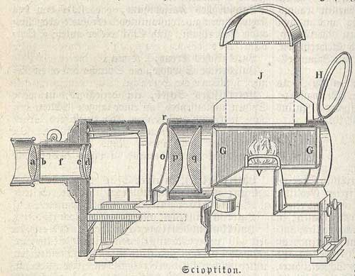 ungenauen Wandtafeln zur Darstellung von Thieren, Pflanzen, Mineralien, Felsformen, Landschaften; sie machen eigentlich erst den wahrheitsgetreuen Anschauungsunterricht möglich. In Amerika hat man diesen Vortheil schon längst erkannt. Jede größere Schule besitzt eine Laterna magica, oft deren mehrere und fast jedes naturwissenschaftliche Auditorium ist so eingerichtet, daß es in jedem Moment verdunkelt werden und die Darstellung der Schattenbilder beginnen kann.“