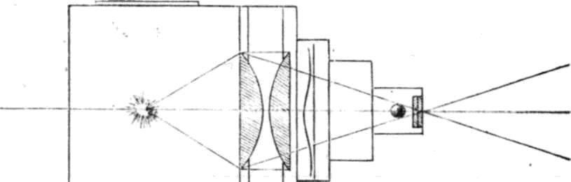 Bei einem Brande, wo sich das rotirende Feuer in der zweiten Laterne befindet, wird in die dritte das Bild der Ruine eingeschoben, durch deren allmäliges Erscheinen die Täuschung veranlasst wird, als ob das Gebäude niederbrennt. Bei fortlaufenden Traumbildern löst sich durch den dreifachen Apparat ein Traum in dem Andern im Hauptbilde auf, während bei dem zweifachen das Hauptbild so lange unverändert erscheint, bis das erste Traum¬bild entfernt und das folgende eingeschoben ist.