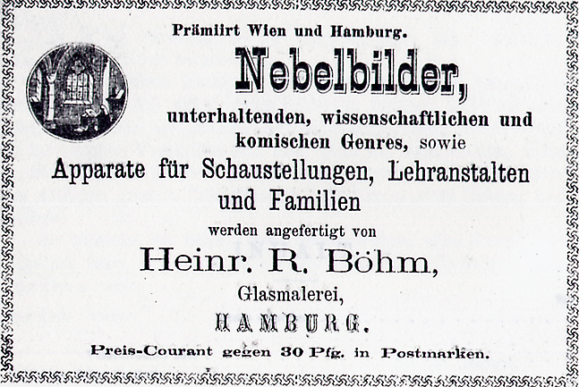 Aus: Böhm, H. R.: Anleitungen zu Darstellungen mittelst der Laterna Magica und den Nebel-Bilder-Apparates, H. G. Voigt’s Buchdruckerei, Hamburg 1876, S. 5 f