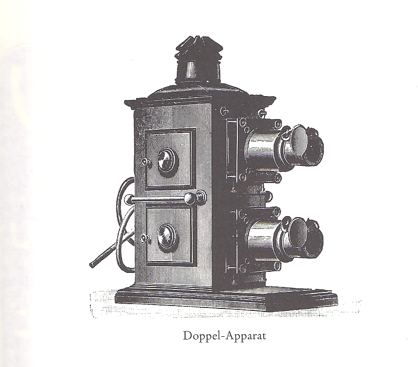 Der Nebel-Bilder-Apparat besteht aus zwei solchen Laternen, jedoch selbstverständlich in verbessertem Linsensatze und Ausstattung. Zuweilen werden auch solche Apparate aus drei Laternen zusammengestellt und mit dem Namen „Agioskop“ bezeichnet.