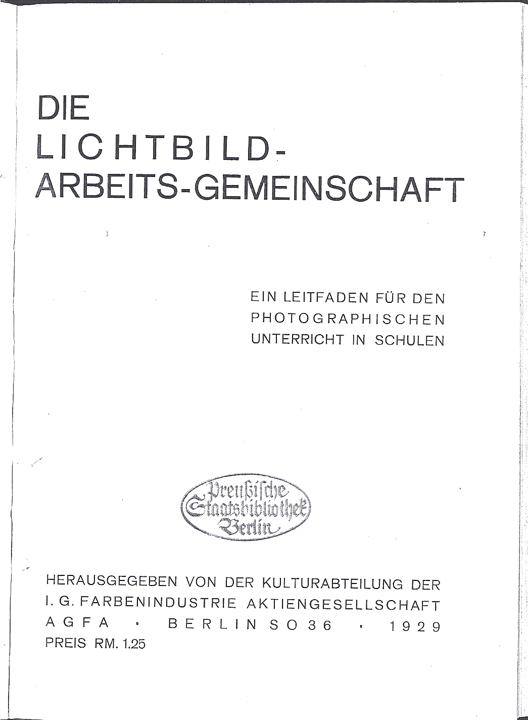 Da seit einiger Zeit die praktische Betätigung von Schülern und Schülerinnen auf dem Gebiet der Photographie einen größeren Umfang annimmt, erscheint es angebracht, daß die berufenen Kreise diese sehr zu begrüßende Bewegung in richtige Bahnen lenken. An einigen Schulen ist man dazu übergegangen, die photographierenden Schüler und Schülerinnen zu sogenannten Lichtbildarbeitsgemeinschaften zusammenzufassen, in denen die Beteiligten neben einer ästhetischen Schulung eine photographische Ausbildung erhalten, damit sie gegebenfalls in der Lage sind, ihre photographische Kunst in den Dienst der ganzen Schule zu stellen. In gemeinsamer Arbeit von Lehrern und Schülern werden die Lichtbildsammlungen ergänzt oder zum Teil für die Sondergebiete neu geschaffen. Eine derartige Selbstherstellung von Lichtbildern jeder Art bietet auch erhebliche wirtschaftliche Vorteile, die bei der schwierigen finanziellen Lage der Schulen noch mehr ausgenutzt werden müssen. Die photographische Arbeitsgemeinschaft ist abwechselnd an die hierfür geeigneten Fächer anzugliedern, damit eine phototechnische Unterweisung der daran interessierten Schüler ständig stattfindet. […]