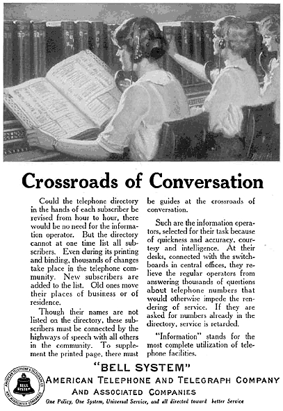 Könnte das Telefonbuch in der Hand des Teilnehmers stündlich überarbeitet Bell Crossroads of Conversation 1923werden, brauchte man keine Telefonauskunft. Aber ein Telefonbuch enthält nie alle Teilnehmer. Selbst während das Telefonbuch gedruckt und gebunden wird, kommt es zu Tausenden von Änderungen. Neue Teilnehmer müssen ins Verzeichnis aufgenommen werden. Alte Teilnehmer ziehen geschäftlich oder privat an einen anderen Ort.