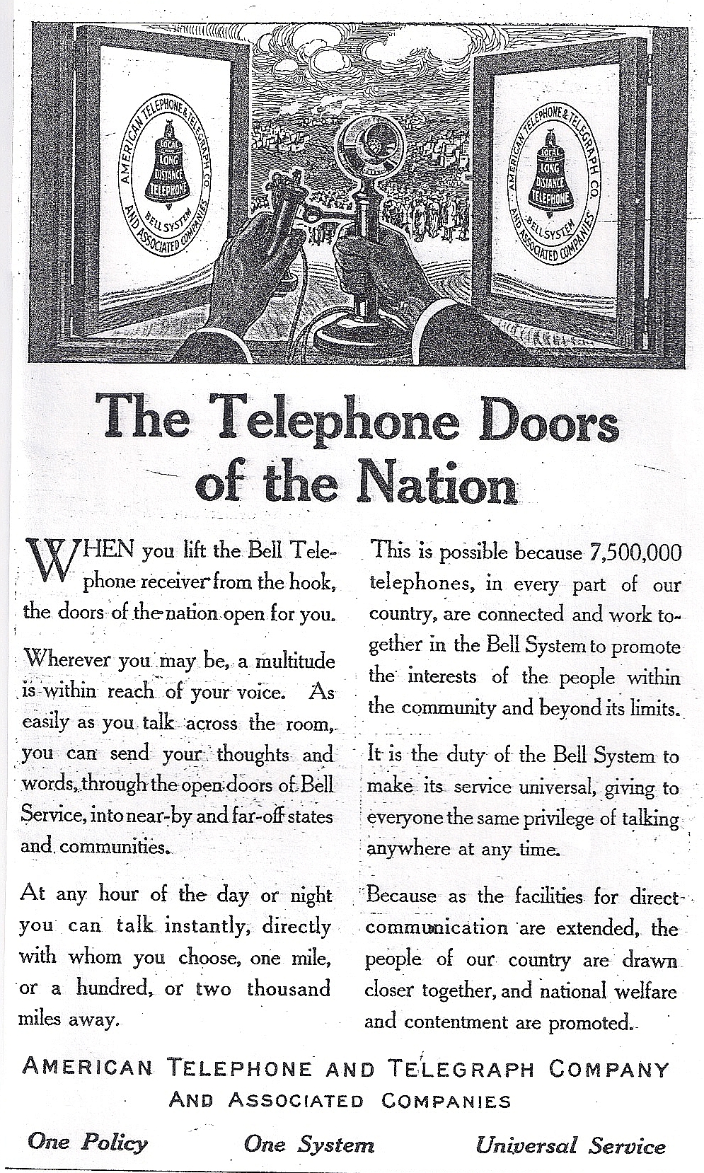 Wo immer Sie sein mögen, können Sie eine Vielzahl von Menschen mit ihrer Stimme erreichen. So einfach, wie man sich in einem Zimmer unterhält, können Sie Ihre Gedanken und Worte durch die offenen Türen des Bell Systems zu nahen oder entlegene Bundesstaaten und Orten schicken.
